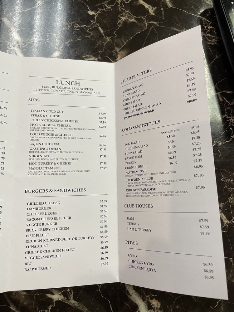 The lunch menu boasts a variety of possibilities, from cold sandwiches like the Club House Ham and Turkey at $11.99, to flavor-packed gyros and wraps, including spicy steak and grilled chicken Caesar options for just $12.99.